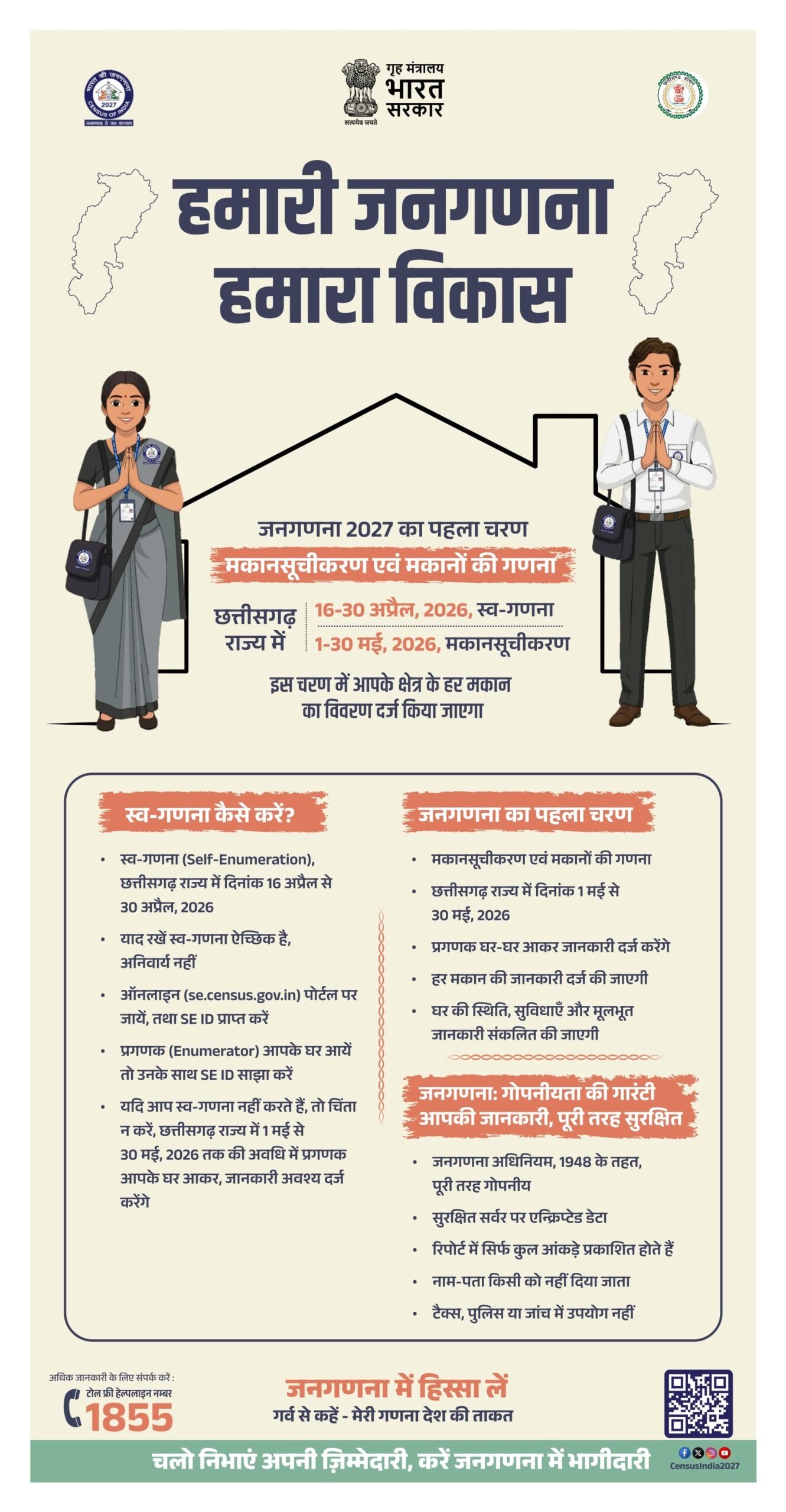 1 मई से 30 मई 2026 तक प्रगणक घर-घर जाकर जानकारी एकत्र करेंगे। जिन्होंने पहले से स्व-गणना कर ली है, वे अपनी यूनिक आईडी साझा करेंगे, जबकि अन्य नागरिकों का विवरण मौके पर ही दर्ज किया जाएगा।