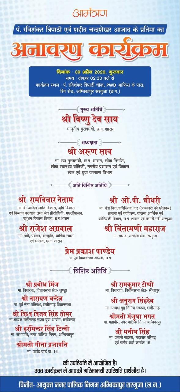 कार्यक्रम की रूपरेखा — तारीख: 09 अप्रैल 2026 (गुरुवार)समय: दोपहर 02:30 बजे सेस्थान: पं. रविशंकर त्रिपाठी चौक, रिंग रोड, अम्बिकापुरनगर पालिक निगम द्वारा आयोजित इस भव्य कार्यक्रम में सरगुजा संभाग के जनप्रतिनिधियों और बड़ी संख्या में आम नागरिकों की उपस्थिति अपेक्षित है। प्रशासन ने सभी तैयारियों को अंतिम रूप दे दिया है।